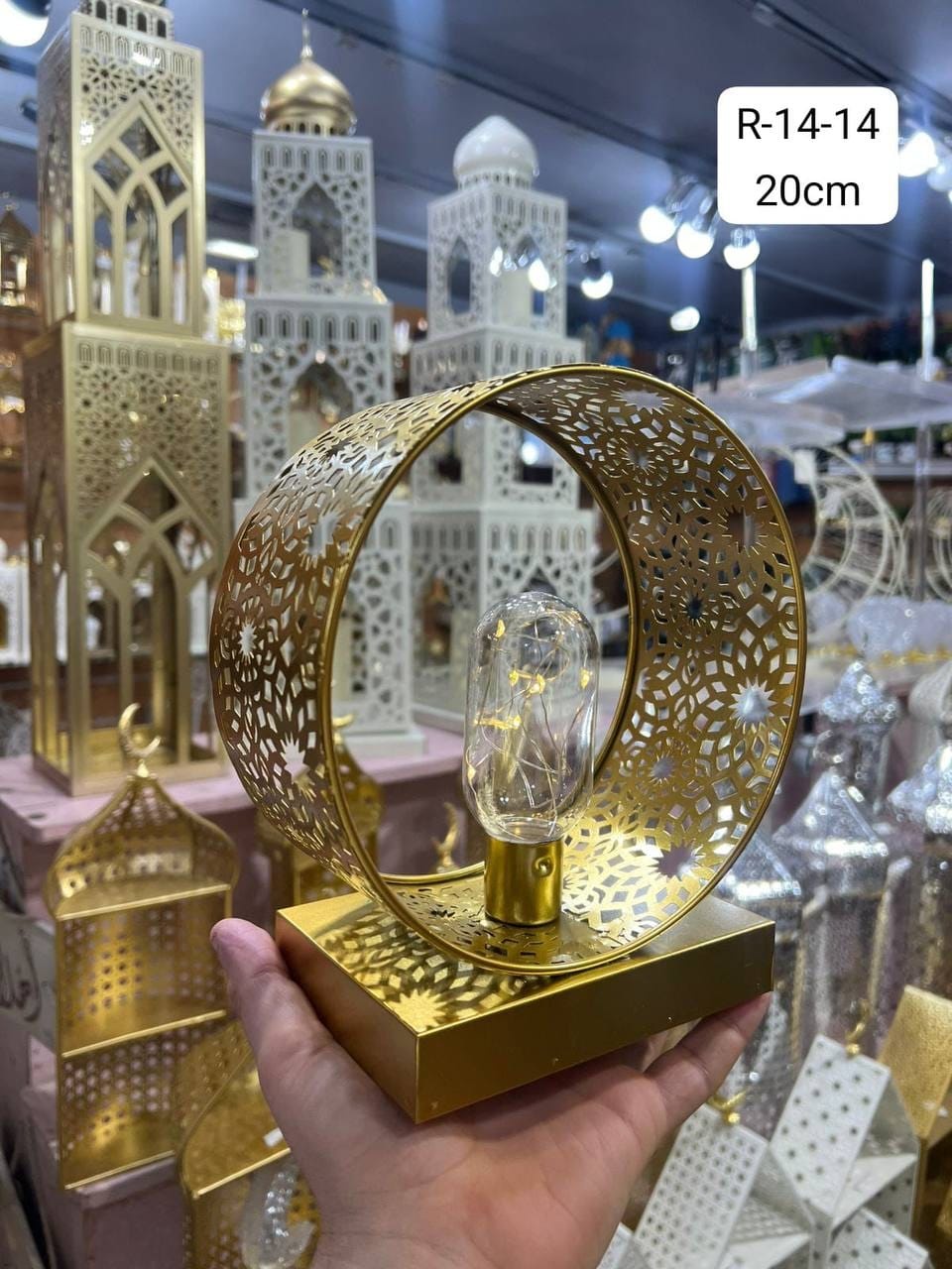 نور دافئ ولمسة فخامة تخطف العين ✨ أباجورة ذهبية بنقوش رمضانية تضيف سحر وأناقة لأي ركن في بيتك.