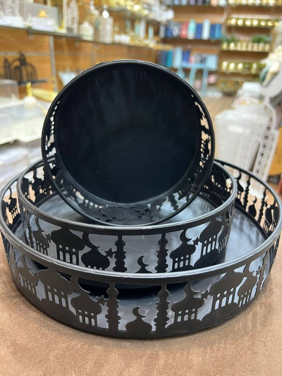 أضيفي لمسة رمضانية راقية إلى مائدتك مع طقم صواني التقديم المعدنية بتصميم مستوحى من المساجد والهلال. يأتي الطقم بثلاث قطع بأحجام مختلفة لتلبية جميع احتياجات الضيافة، سواء لتقديم القهوة والتمور أو الحلويات والمكسرات. لونه الأسود الأنيق مع النقوش المفرغة يمنح طابعًا عصريًا فاخرًا يتناسق مع ديكورات الشهر الكريم ويجعل سفرتك أكثر تميزًا في الإفطار والسحور.