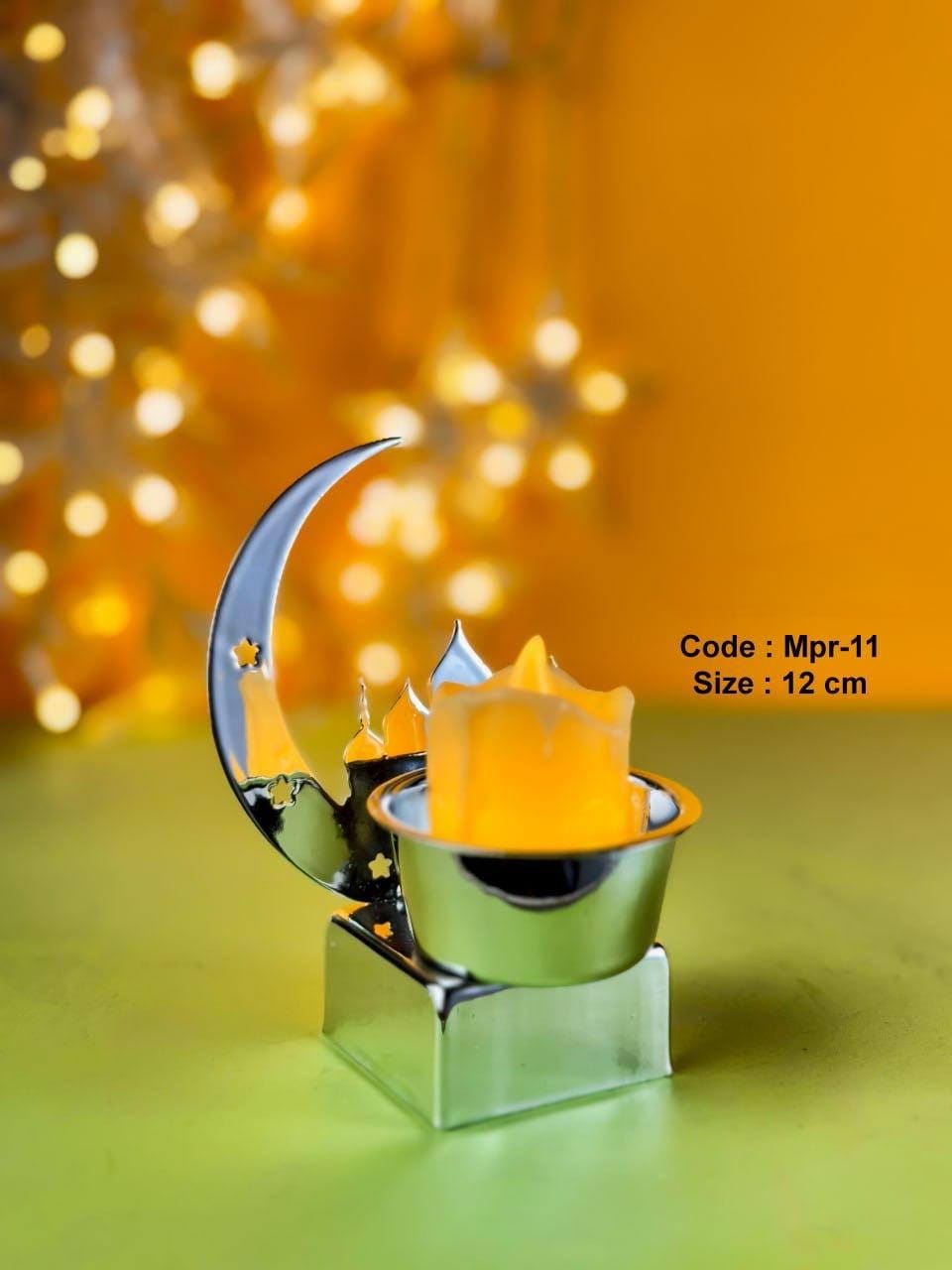 شمعدان مميز بتصميم هلال ونجمة يعبّر عن أجواء رمضان بروح عصرية أنيقة. مصنوع من معدن لامع بتفاصيل محفورة بدقة، مع قاعدة ثابتة وحامل مخصص للشمعة، ليضيف إضاءة دافئة ولمسة ديكور راقية على السفرة أو الكونسول أو ركن الضيافة. حجمه العملي (12 سم) يخليه مناسب لأي مساحة من غير ما ياخد حيز كبير.