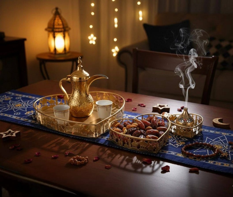 حوّلي جلسات الإفطار والسحور إلى لحظات مميزة مع طقم الضيافة الرمضاني الأنيق. تصميم معدني أسود بنقوش مستوحاة من الطابع الإسلامي يمنح طاولتك لمسة راقية وعصرية في آنٍ واحد. مثالي لتقديم القهوة العربية، التمور، المكسرات والحلويات، ليجتمع الجمال والعملية في قطعة واحدة تكمل أجواء الشهر الفضيل بروح دافئة ومميزة.