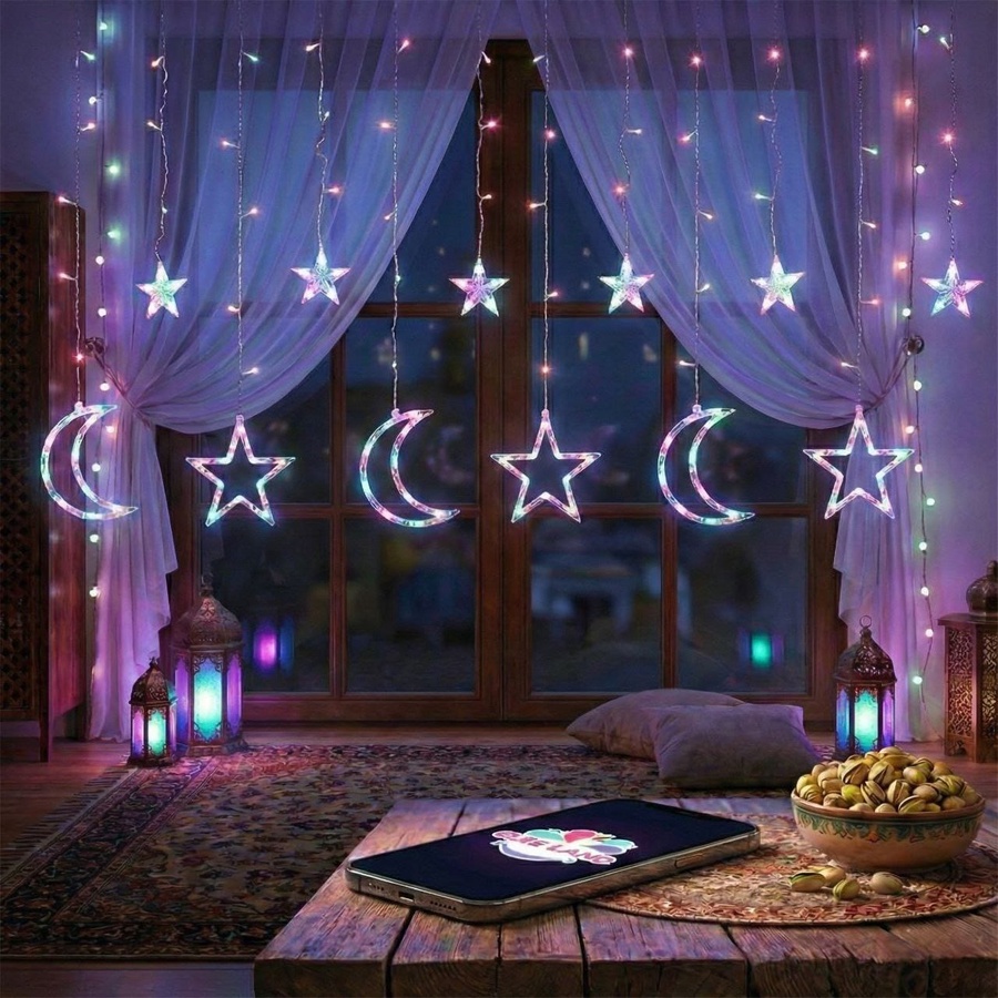حوّل بيتك لعالم كله سحر مع ستارة نجوم وهلال LED ملونة، نورها الهادي يخلق جو رمضاني مختلف ويخلي كل قعدة مليانة بهجة 🌙✨