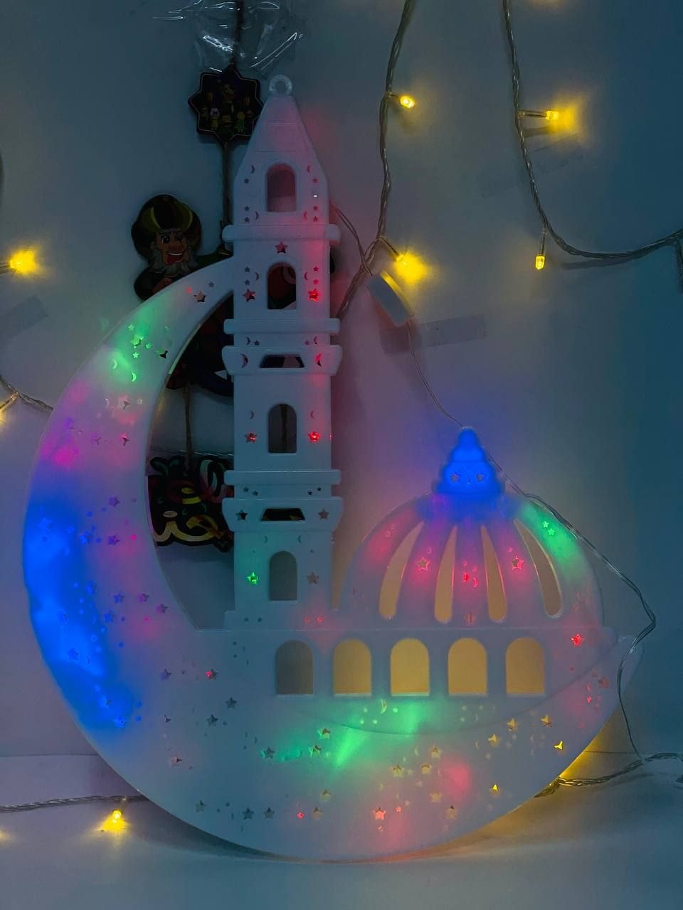 زينة رمضان مضيئة بتصميم جميل على شكل هلال مع مسجد ومئذنة، بتطلع إضاءة LED ملونة تدي جو رمضاني مبهج لأي مكان.