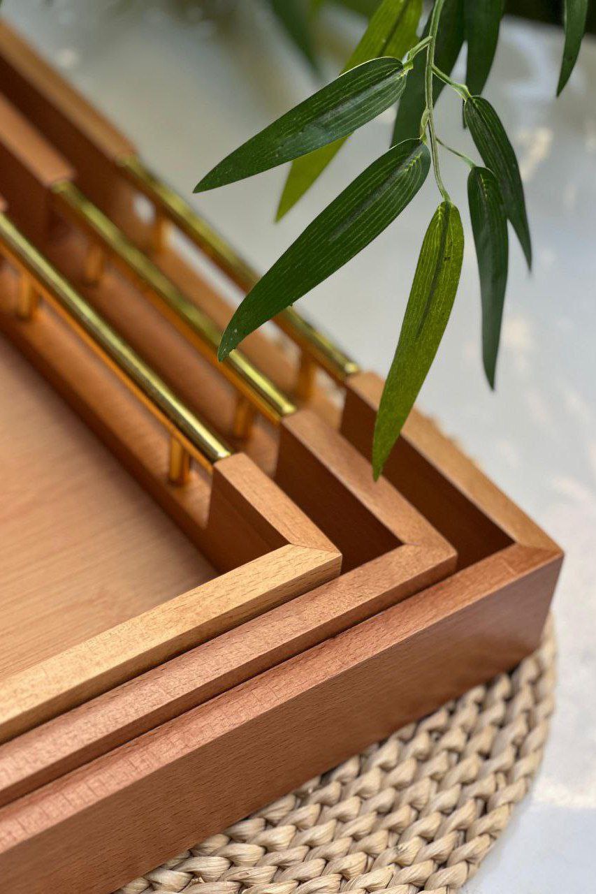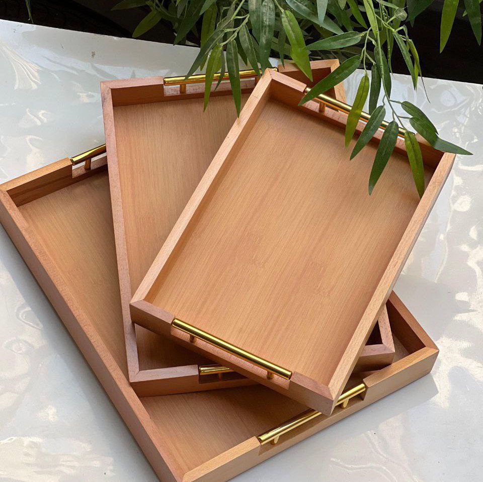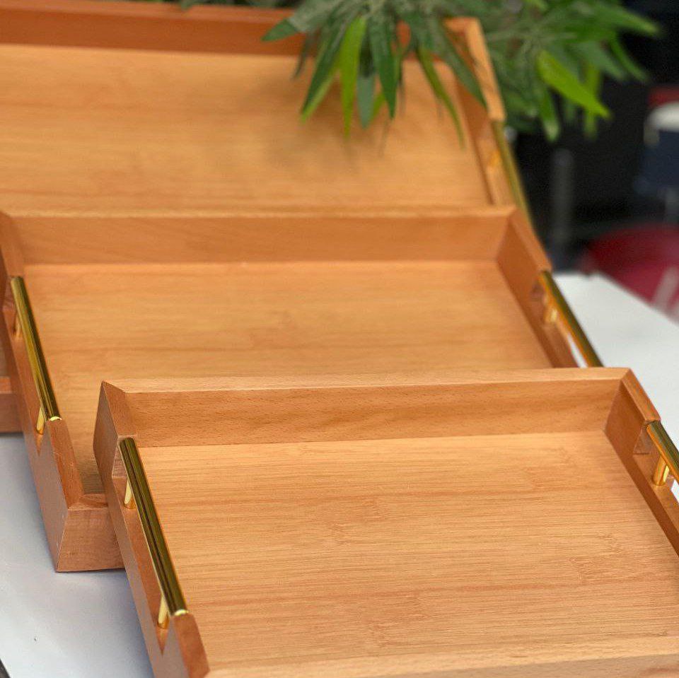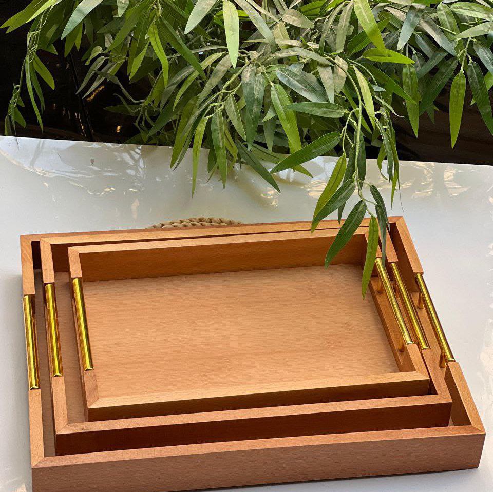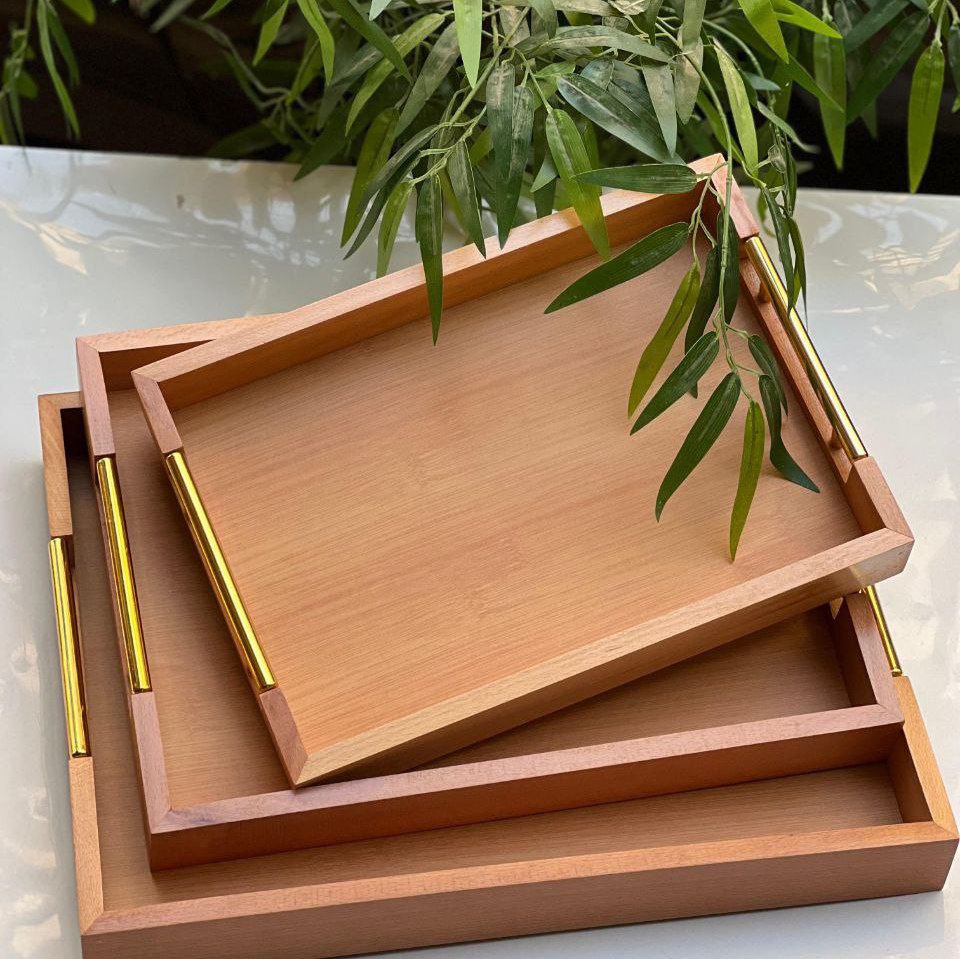 طقم صواني خشب بامبو عالي الجودة بيد استيل ذهبي، تصميم أنيق وعملي للتقديم في الإفطار والسحور والضيافة طوال رمضان.