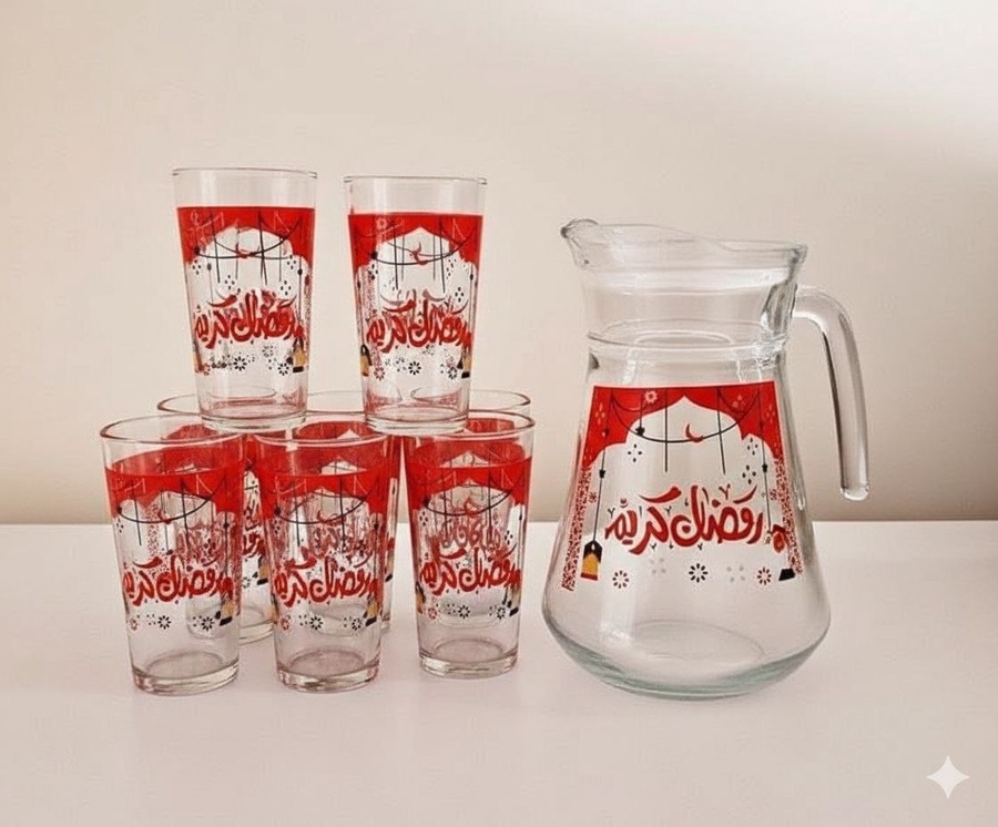 طقم إبريق زجاجي مزخرف بعبارات رمضانية مع 6 أكواب، تصميم أنيق وعصري لتقديم المشروبات، يضفي جو رمضاني مميز على سفرتك.